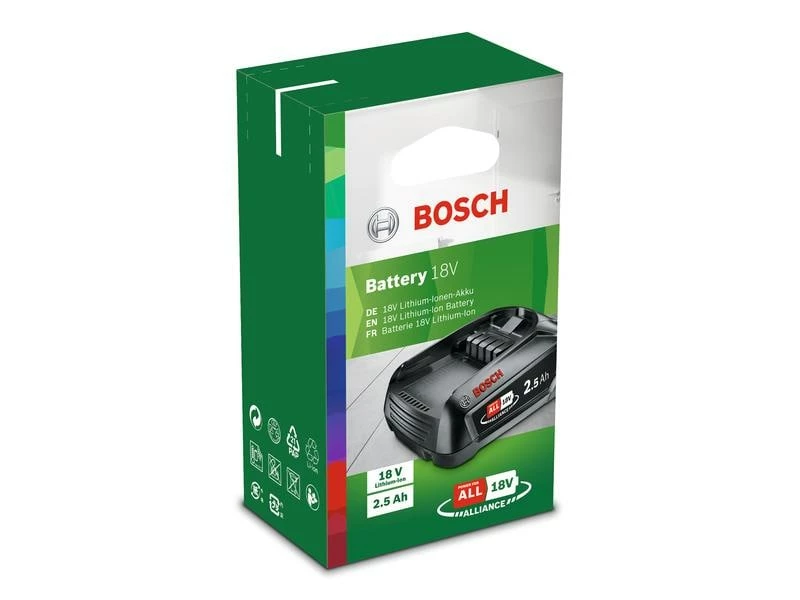 Dieser 18V-Akku bietet eine Kapazität von 2,5 Ah und passt zu allen Geräten der Power4all-Gerätefamilie (18V-Geräte) von Bosch. Sie können mit ihm also nicht nur ein Gerät, sondern eine gesamte Gerätefamilie rund um Haus und Garten mit Strom versorgen.