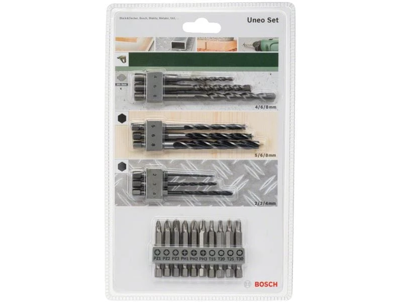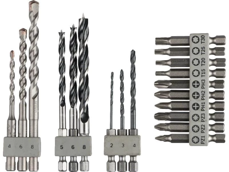 Die leistungsfähigen Bohrer für eine Vielzahl von Materialien. Mit den Schrauberbits sind Sie zudem für alle Arten von Montagearbeiten bestens ausgerüstet. Im Set sind enthalten: