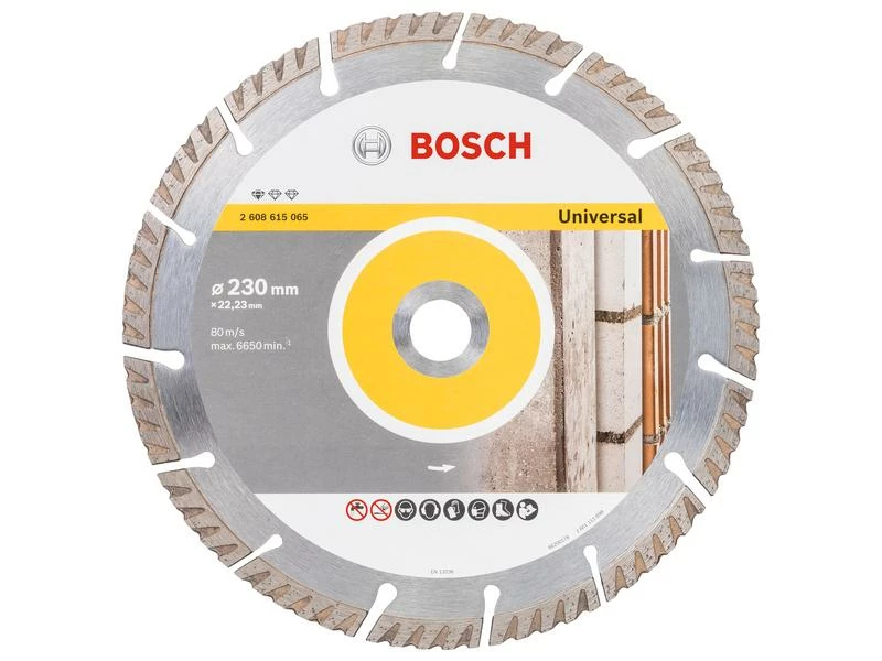 Die Diamanttrennscheibe Standard for Universal ermöglicht zuverlässiges Schneiden in allgemeines Baumaterial. Ihre optimierte Diamantmatrix ermöglicht mit ihrem hohen Qualitätsstandard zuverlässige Ergebnisse. Das Bosch-Kompetenzzentrum Diamant in der Schweiz gewährleistet diesen Standard durch das kontinuierliche Bereitstellen konsistenter Qualität. Geeignet zum Schneiden von Beton und Mauerwerk.
