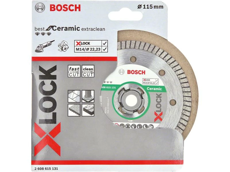 X-LOCK Diamanttrennscheibe Best for Ceramic Extra Clean Turbo für besonders saubere Schnitte in Porzellan. Mit dem Turborand lassen sich saubere Ergebnisse in Hartkeramik aller Art erzielen und die optimierte Diamantmatrix schneidet splitterfrei. Geeignet zum Schneiden von Keramik, Porzellan und Feinsteingut. Dank schlüssellosem X-LOCK System lassen sich die Trennscheiben schnell und bequem wechseln. X-LOCK Trennscheiben passen auch auf Standard-Winkelschleifer.