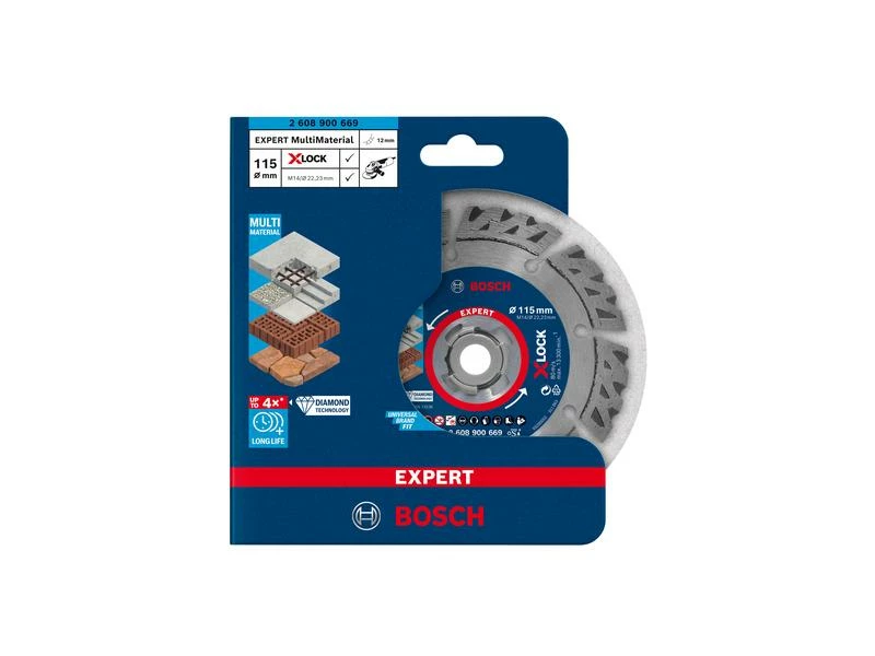 Hält bis zu 4-mal länger als eine Standard-Multi Material-Diamanttrennscheibe. Die Expert MultiMaterial Trennscheibe ist das ideale Zubehör für vielbeschäftigte Bauprofis, die Beton, Ziegel, Dachziegel und Stahlbeton schneiden müssen, denn sie bietet einfach eine höhere Lebensdauer. Die hohen Segmente dieser Trennscheibe bestehen aus einer fortschrittlichen Matrix aus Metall und Diamanten, die äusserst scharf bleibt. Diese Segmente werden auf einen harten Stahlkörper lasergeschweisst. Die Seiten sind geriffelt, damit Staub entfernt wird. So werden Effizienz und Langlebigkeit verbessert. Diese Mischung aus optimaler Diamantkörnung und fortschrittlichen Designmerkmalen sorgt für eine unübertroffene Langlebigkeit der Bosch Expert MultiMaterial X-LOCK Diamanttrennscheibe. Sie schneidet zuverlässiger und länger als andere Diamantscheiben von Bosch und bietet letztendlich ein hervorragendes Preis-Leistungs-Verhältnis. Mit X-LOCK genügt ein Klick – das schnellste Wechselsystem für Zubehör, das es auf dem Markt gibt. Passt auch für Winkelschleifer mit Mutter und Gewinde.