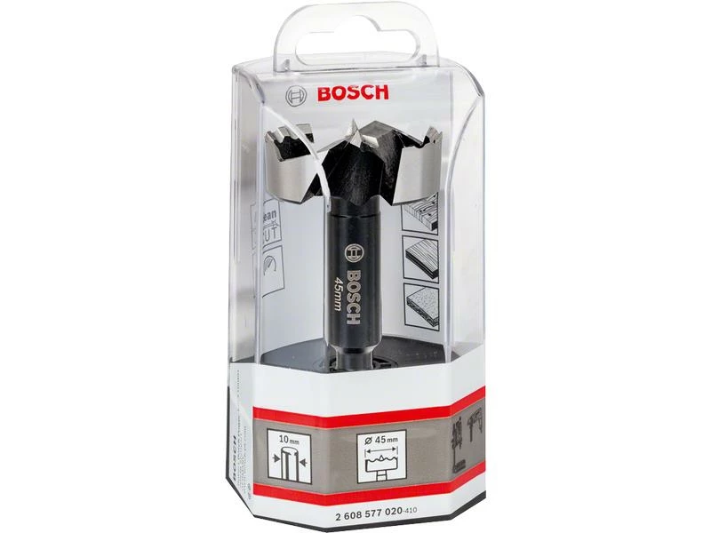 Der Forstnerbohrer besitzt eine hervorragende Lebensdauer beim Bohren von Präzisionslöchern. Das zahnförmige Design sorgt für weniger Reibung und Hitze, woraus sich eine höhere Haltbarkeit ergibt. Die kurze Zentrierspitze des Präzisionsbohrers hat zwei Hauptschnittkanten und eine Peripherschnittkante (zahnförmig) für exakte Ergebnisse. Durch die grossen spänefreien Zonen, die einen optimierten Späneabtransport ermöglichen, wird die Schnellbohrpräzision des Bohrers weiter unterstützt. Er ermöglicht ein glattes, splitterfreies Bohren von Blindlöchern sowie das Bohren an Kanten und Schrägen, z. B. für die Befestigung von Scharnieren, das Dübeln oder Entfernen von Astlöchern. Für das Bohren in Weich- oder Hartholz, Furnierholz und nicht laminierte Spanplatte. Der 3-seitige Schaft des Forstnerbohrers verhindert ein Durchdrehen im Spannfutter. Er ist gemäss DIN 7483G hergestellt, mit einer Schneidenhärte von mindestens 50 HRC. Er ist für alle Bohrer (Bohrschrauber, Standbohrmaschinen) mit 10-mm-Spannfutter geeignet.