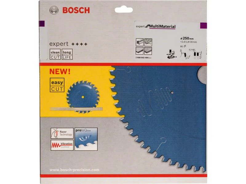 Das Expert for Multi Material Kreissägeblatt macht perfekte zuverlässige Schnitte in viele Materialien. Die einzigartigen besonders harten Microteq-Zähne werden bei Bosch intern aus höchst robustem Carbide-Korn produziert, um eine hohe Leistung sicherzustellen. Das spezielle Carbide und die robuste Zahnform machen das Expert for Multi Material Kreissägeblatt ideal für den universellen Gebrauch in jeder Situation. Die Schutzbeschichtung des Blatts verhindert Korrosion und ermöglicht zuverlässiges Schneiden, während Reibung reduziert wird. Das Produkt ist mit Dämpfungsschlitzen für einen besonders ruhigen Lauf, deutlich weniger Geräusche und spürbar geringere Vibration ausgestattet. Verwenden Sie dieses Sägeblatt für Aluminium, Nichteisenmetalle, Kunststoff, Epoxidharz und Holz. HLTCG-Zähne (High-Low Triple Chip Ground) machen das Expert for Multi Material Kreissägeblatt robust für die Arbeit mit abrasiven Materialien. Kompatibel mit Kapp- und Gehrungssägen.
