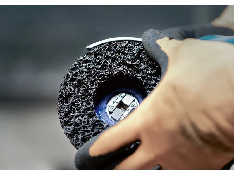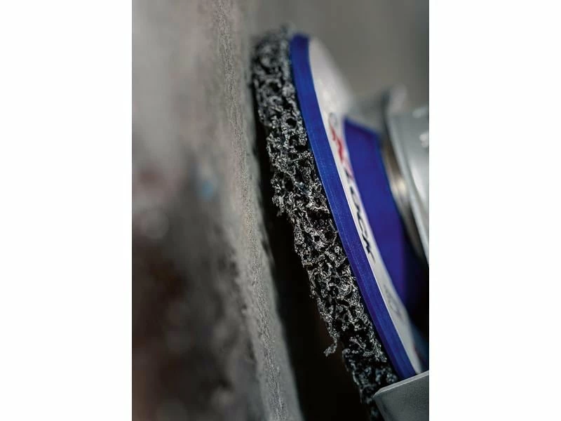 Die X-LOCK Reinigungsscheibe N377 Metall reinigt Metall- und Mauerwerkflächen schnell und gründlich. Das 3D-Faservlies mit offener Struktur ermöglicht eine hohe Materialabtragsrate ohne Verstopfen der Scheibe. Zudem ist das 3D-Faservlies mit Siliziumkarbid besetzt, das sich ständig selbst schärft – für einen effizienten und gleichmässigen Materialabtrag. Die Scheibe ist für das Entfernen von Rost, Farbe und Oxidschichten auf Metallflächen sowie zum Beseitigen von Kalkablagerungen, Moos und Graffiti auf Stein, Marmor und Beton vorgesehen. Für den Halt der Reinigungsscheibe sorgt ein Glasfaserstützteller. Dank schlüssellosem X-LOCK System lassen sich die Reinigungsscheiben schnell und komfortabel wechseln.