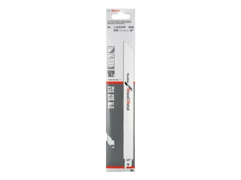 Geeignet für Säbelsägen mit 0.5-Zoll-Universalschaftsystemen. Das S 1122 VF Flexible for Wood and Metal Säbelsägeblatt eignet sich für mühelose bündige Schnitte in Holz und Metall. Die Vario Zahngeometrie ermöglicht glattes, vibrationsreduziertes Schneiden. Die Standard-Wandstärke (0.9 mm) und Länge ermöglichen exzellentes bündiges Schneiden. Das Bimetallblatt ist für das Schneiden von weichen Nägeln, Baustahl und NE-Metallkomponenten in Holz optimiert. Es verfügt über eine Standardlänge (225 mm) für eine Schnittleistung von bis zu 175 mm.