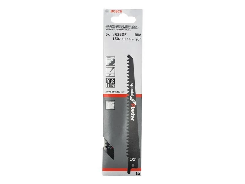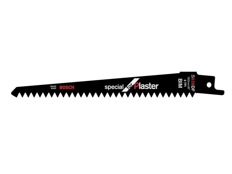 Dieses Säbelsägeblatt ist ideal für die Nutzung mit Akkusägen. Es verfügt über ein 0.5-Zoll-Universalschaftsystem. Das S 628 DF Special for Plaster Säbelsägeblatt macht saubere Kurvenschnitte in Sonderwerkstoffe. Mit seinen geschliffenen Zähnen liefert ausrissfreie Ergebnisse, während der vollständig verjüngte Körper einfachen Zugang zu schwer erreichbaren Stellen bietet und Kurvenschnitte ermöglicht. Die geschliffene Spitze eignet sich für Tauchschnitte. Die Zahnleiste aus gehärtetem HSS (Schnellarbeitsstahl) und BIM (Bimetall) ist mit hochelastischem HCS (Kohlenstoffstahl) verstärkt, wodurch das Blatt zum Schneiden von Schleifmaterial, wie Gipskartonplatten, geeignet ist. Die Standardlänge von 150 mm ermöglicht eine Schnittleistung von bis zu 100 mm.