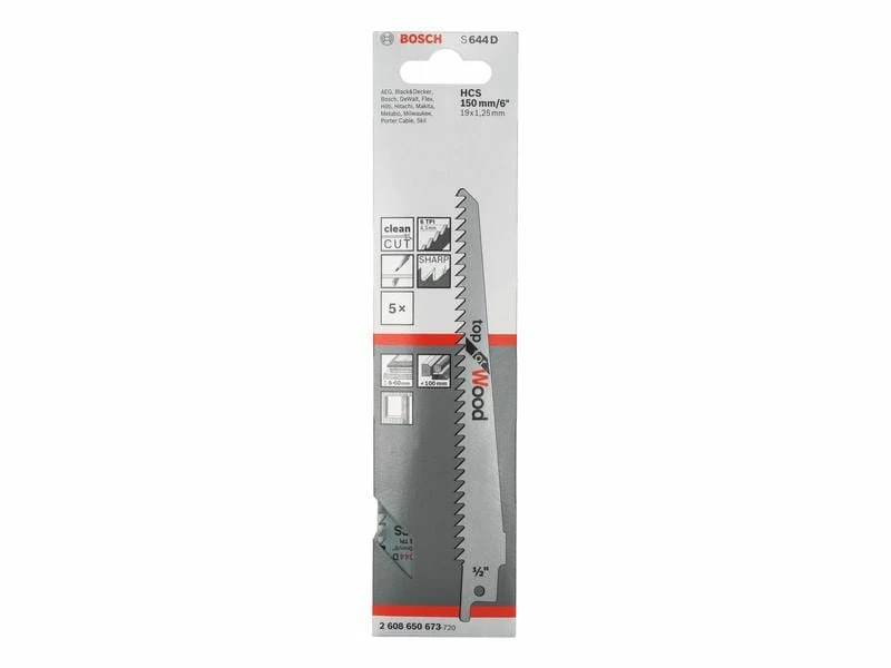 Geeignet für Säbelsägen mit 0.5-Zoll-Universalschaftsystemen. Das S 644 D Top for Wood Säbelsägeblatt macht saubere Kurven- und Tauchschnitte in Holz. Die scharfgeschliffenen Zähne sorgen für ausrissfreie Schnitte. Das sich vollständig verjüngte Blatt ermöglicht ausserdem einfachen Zugang zu schwer erreichbaren Stellen und macht Kurvenschnitte möglich. Die geschliffene Spitze ist speziell für Tauchschnitte vorgesehen. Das Blatt aus HCS-Stahl (Stahl mit hohem Kohlenstoffgehalt) eignet sich für das Schneiden von weichem Holz, Bauholz und allen nichtabrasiven Holzwerkstoffen bei Bauarbeiten. Es verfügt über eine Standardlänge von 150 mm, die eine Schnittleistung von bis zu 100 mm ermöglicht.
