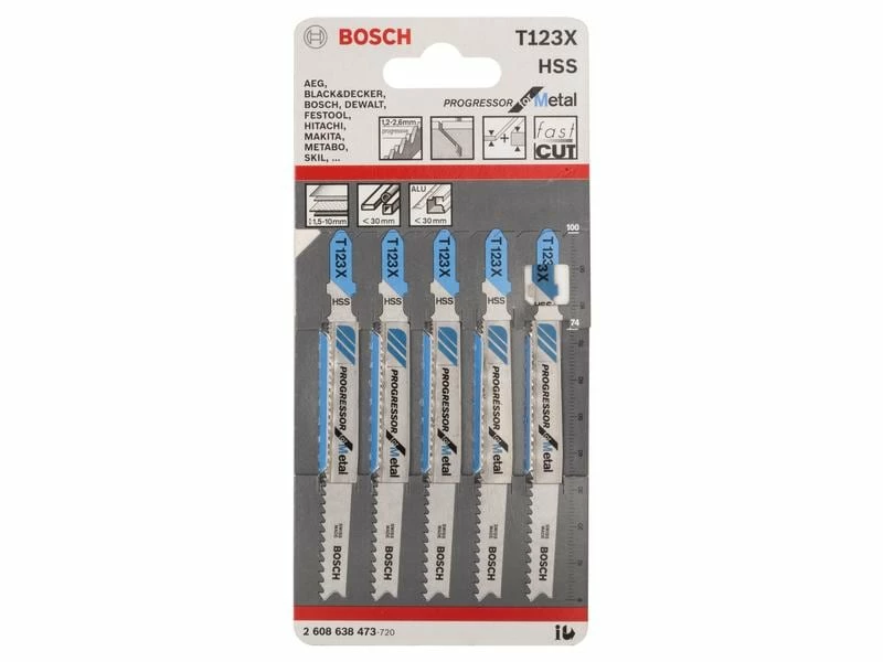 Für den Gebrauch mit Stichsägen mit T-Schaft-Aufnahme. Das T 123 XF Progressor for Metal Stichsägeblatt ist bruchfest und macht schnelle gerade Schnitte in dünnes und starkes Metall. Die Zahngeometrie mit progressiv ansteigender Zahnteilung ermöglicht die Arbeit mit Materialien mit unterschiedlichen Dichten. Die gefrästen, gewellten Zähne sind für schnelle Schnitte in Metallblech konzipiert. Die Zahnleiste aus gehärtetem HSS (Hochgeschwindigkeitsstahl) und BIM ist mit hochelastischem HCS verstärkt, wodurch das Bruchrisiko reduziert wird, und sowohl genügend Festigkeit als auch die Flexibilität geboten werden, um perforiertes Metallblech aus Stahl (Standard-Stärke) zu schneiden. Das Stichsägeblatt ist mit einer feinen progressiven Zahnteilung (1.2-2.6 mm) ausgestattet und schneidet viele starke und dünne Metallbleche mit einer Dicke von 1.5-10 mm.