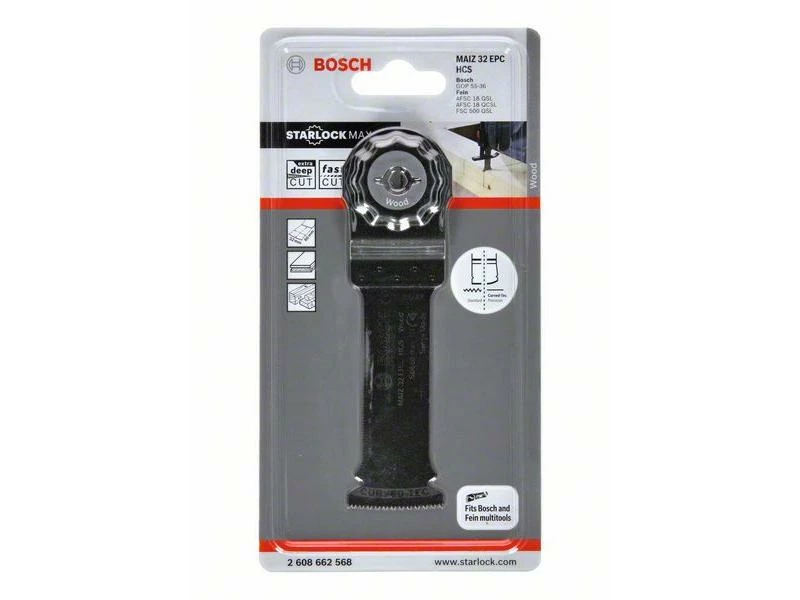 Das Tauchsägeblatt Starlock MAIZ 32 EPC ermöglicht besonders tiefe Schnitte in Holz. Seine Länge von 80 mm erhöht die Reichweite für ausgedehnte Schnitte. Die direkte Kraftübertragung und das robuste Starlock-Aufnahmesystem reduzieren Lateralschwingung und ermöglichen längere präzise Schnitte. Mit diesen robusten Merkmalen ist dieses Produkt ideal geeignet für tiefe Tauchschnitte in Holz und Holzbalken sowie zum Anfertigungen von Aussparungen für Zapfen und Verbindungen. Das Blatt durchschneidet auch massives Weichholz. Eine abgerundete Blattspitze (Curved-Tec) ermöglicht präzise und glatte Tauchschnitte. Das System Starlock Max ermöglicht selbst bei härtestem Einsatz maximale Schnitttiefe, Geschwindigkeit und Vielseitigkeit. Zusätzlich ermöglicht das Starlock-Aufnahmesystem schnellen Blattwechsel in drei Sekunden ohne Blattberührung. Das spezielle Starlock-Aufnahmesystem ermöglicht durch seine dreidimensionale enge Passung maximale Kraftübertragung zwischen Maschine und Zubehör. Mit diesem Produkt kompatibel sind alle Elektrowerkzeugen des Typs Starlock Max.