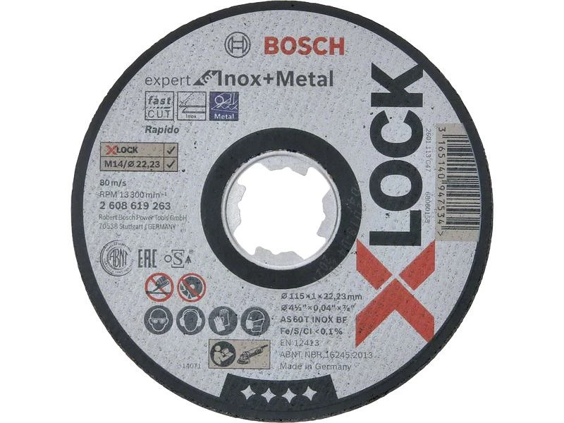 Die X-LOCK Trennscheibe Expert for Inox and Metal kombiniert eine enorme Trennleistung in Stahl mit maximaler Sicherheit. Die Scheibe besteht aus Premium-Aluminiumoxid mit funktionalen Füll- und Zusatzstoffen, die die Wärmeentwicklung beim Schneiden reduzieren. Das Ergebnis sind eine hochwertige Schnittfläche und eine lange Lebensdauer der Scheibe. Zudem ist die Scheibe frei von Eisen, Schwefel und chlorierten Füllstoffen. Das präzisionsgefertigte Glasfasergewebe der Scheibe sorgt für maximale Arbeitssicherheit. Diese Scheibe ist zum Bearbeiten von Metall und rostfreiem Stahl geeignet. Dank schlüssellosem X-LOCK System lassen sich die Trennscheiben schnell und bequem wechseln. X-LOCK Trennscheiben passen auch auf Standard-Winkelschleifer.