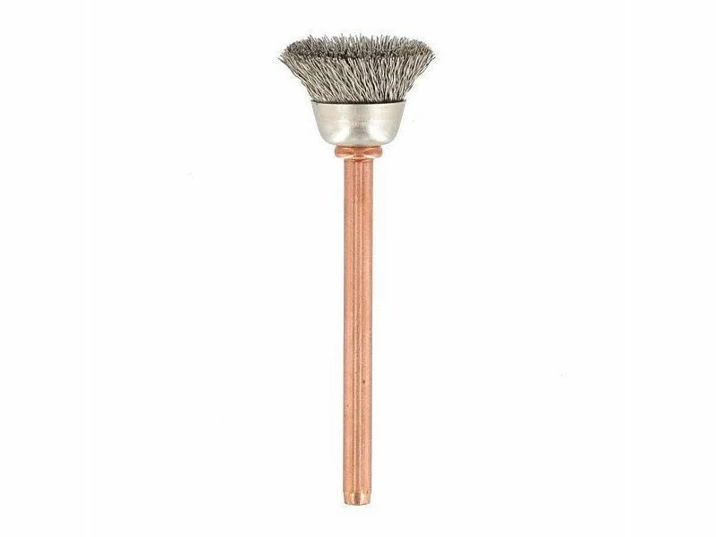 Mit der Dremel Edelstahlbürste 531 sind Arbeiten an mittelgrossen Werkstücken möglich. Die speziell angewinkelte runde Kopfform mit 13,0 mm Durchmesser schmiegt sich besonders auch in Vertiefungen an das zu bearbeitende Material an. Durch die Höchstdrehzahl von 15.000 rpm lassen sich mit dieser Edelstahlbürste auch hartnäckige Korrosionsrückstände, Rost und weitere Metallverschmutzungen entfernen.