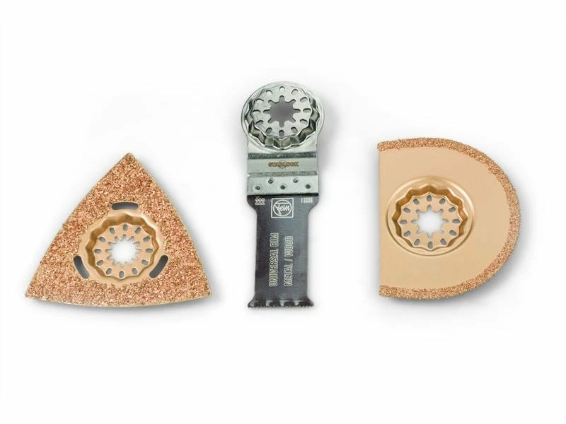 1 E-Cut Universal Sägeblatt (55 x 28 mm), 1 Hartmetall-Raspel (80 mm), 1 Hartmetall-Segmentsägeblatt (Ø 75 mm, 2,2 mm).