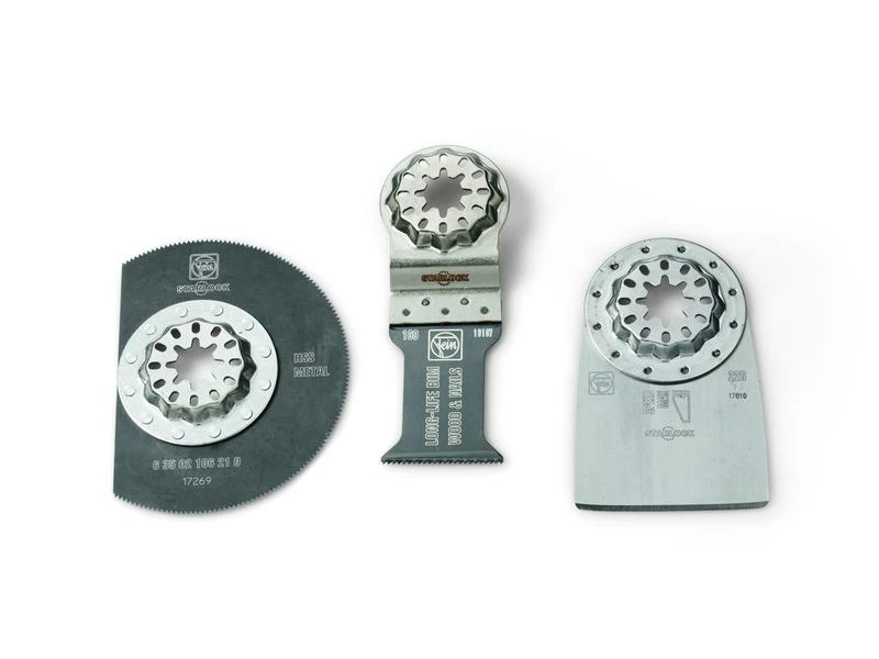 1 Hartmetall-Segmentsägeblatt (Ø 85 mm), 1 E-Cut Long-Life Sägeblatt (50 x 35 mm), 1 fester Spachtel.