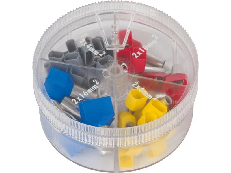 - 20x grau 2 x 4 mm², 10x gelb 2 x 6 mm², 10x rot 10 mm² und 5x blau 2 x 16 mm²