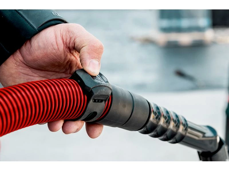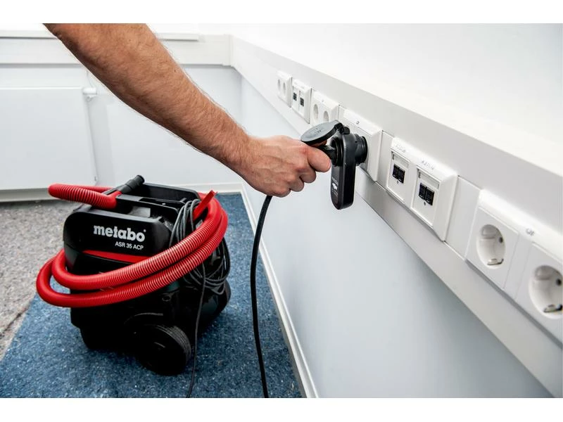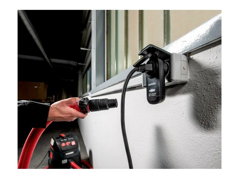 Netzsauger mit der Empfänger-Steckdose einstecken. Sender mit Multiband am Schlauch hinter der Muffe oder direkt an der Maschine befestigen. Netzsauger auf »manuell« drehen oder einschalten. Akku-Maschine starten. Sauger wird automatisch durch die Wahrnehmung von Vibrationen ein-/ausgeschaltet