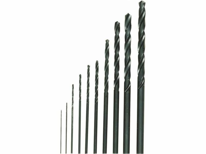 Der HSS Spiralbohrsatz nach DIN 338 (10tlg) enthält Bohrer der Durchmesser 0,3 – 0,5 – 0,8 – 1,0 – 1,2 – 1,5 – 2,0 – 2,5 – 3,0 – 3,2mm. Sie haben eine kegelförmige Schneide, die auf die Bearbeitung von Metall ausgelegt ist. Die Bohrer werden zum Bohren von Nichteisenmetallen (NE-Metall), Stahl und Edelstahl verwendet.