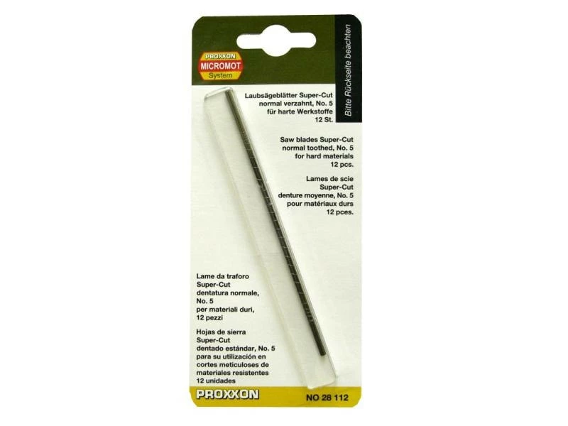 Die normal verzahnten Super-Cut-Laubsägeblätter sind für die Bearbeitung von Werkstoffen wie Eisen oder Pertinax. Da es sich hierbei um harte Materialien handelt, sorgt die Fertigung aus hochvergütetem Spezialstahl neben einer langen Lebensdauer auch für eine hohe Schnittleistung. Die Masse der Sägeblätter belaufen sich auf 130 x 0,85 x 0,4 mm.