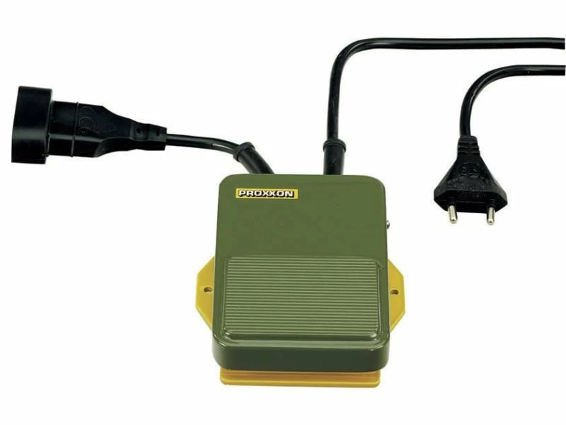 Verwenden Sie den Fussschalter FS zusammen mit Ihrem Proxxon-Gerät, um beide Hände für die Arbeit zur Verfügung zu haben. Das Anschlusskabel des Werkzeugs wird dazu einfach mit dem Fussschalter verbunden und dieser an die Steckdose angeschlossen. Bei Micromot-Geräten mit Netzteil schliessen Sie dieses an den Fussschalter an.