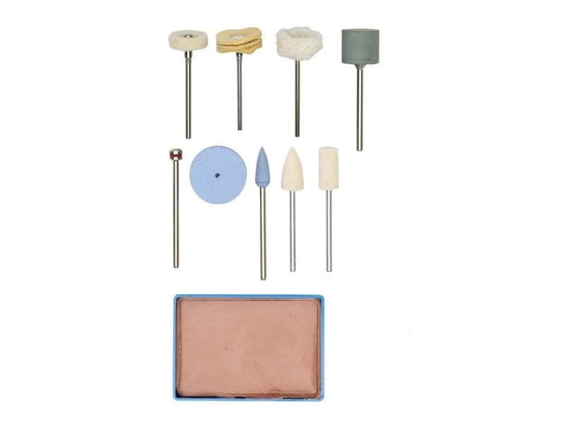 Das Set besteht aus je einem Stück Filzpolierstift (Zylinder-, Kegel- und Radform), Silikon-Polierstift (Geschoss-, Zylinder- und Scheibenform), Baumwollpolierscheibe, Wildlederschwabbel und Polierpaste. Inklusive Werkzeugträger 2,35 x 44 mm.