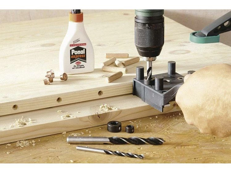 Das Universal-Holzdübel Starter-Set von Wolfcraft enthält alles, um die gängigen Holzdübel-Verbindungen wie beispielsweise Eck-, T- und Flächenverbindungen zu fertigen.